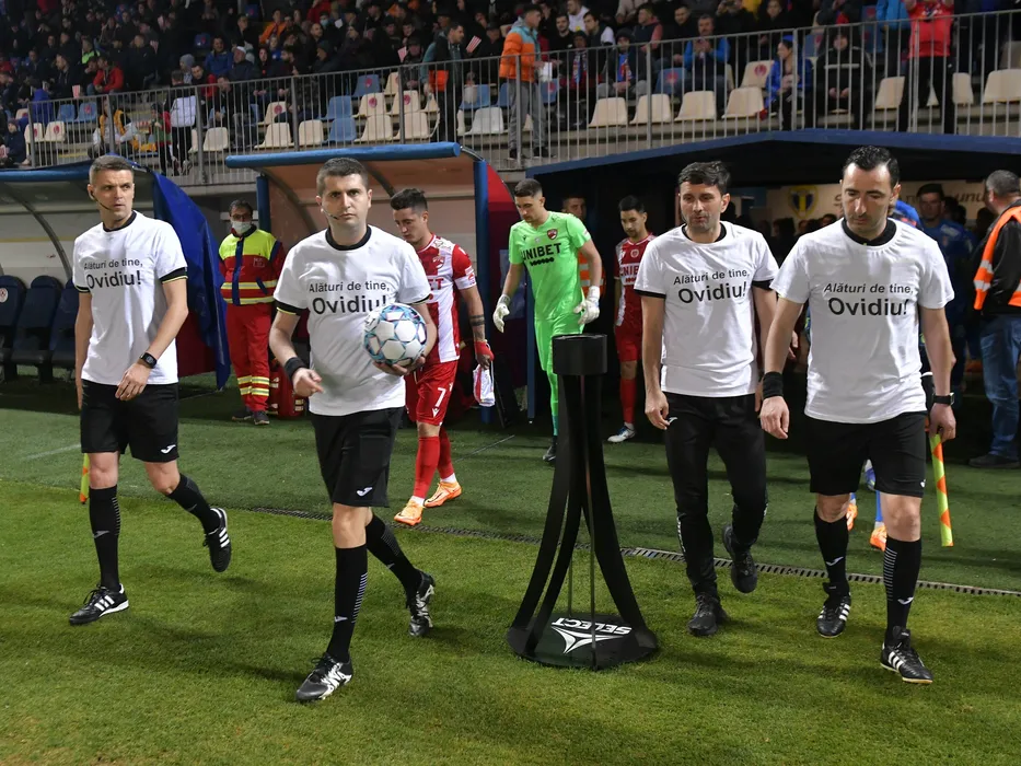Brigada de arbitri formata din George Florin Neacsu, Andrei Florin Chivulete, Sebastian Coltescu si Andrei Constantinescu iese pe teren purtand tricouri de incurajare la adresa colegului lor Ovidiu Hategan la meciul de fotbal dintre Chindia Targoviste si Dinamo Bucuresti, contand pentru Play-out-ul Ligii 1 Casa Pariurilor, desfasurat pe Stadionul Ilie Oana din Ploiesti, vineri 1 aprilie 2022. © FOTO:Razvan Pasarica/SPORT PICTURES