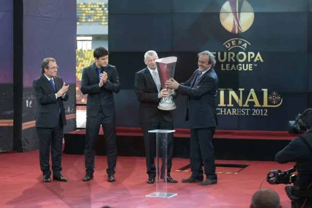 Oprescu a primit trofeul Europa League de la Platini:** „Aveți un stadion fabulos” / „Gazonul va fi funcționabil” FOTO