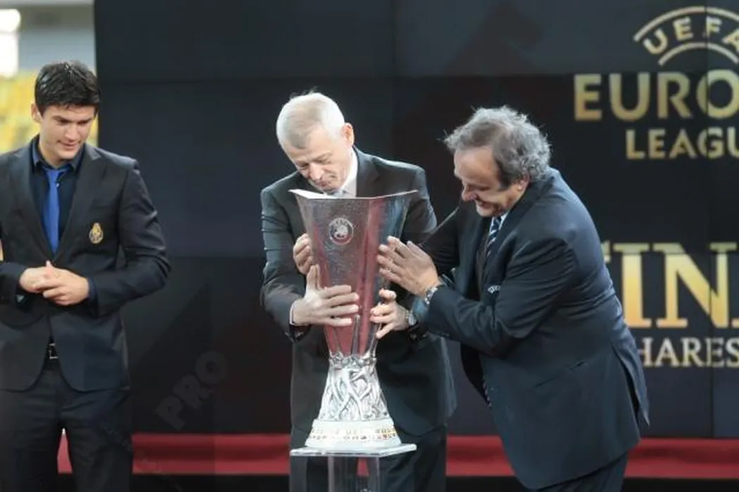 Oprescu a primit trofeul Europa League de la Platini:** „Aveți un stadion fabulos” / „Gazonul va fi funcționabil” FOTO