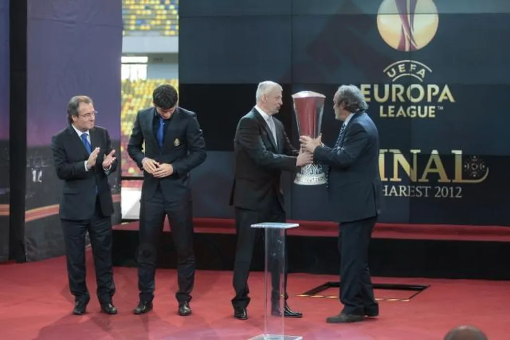 Oprescu a primit trofeul Europa League de la Platini:** „Aveți un stadion fabulos” / „Gazonul va fi funcționabil” FOTO