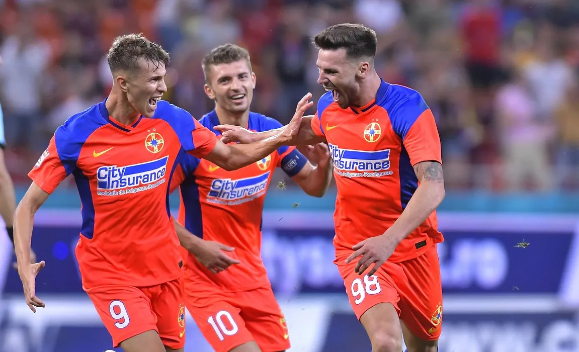 Andrei Ioan Cordea se bucura dupa un gol marcat alaturi de Florin Lucian Tanase si Octavian George Popescu in meciul de fotbal dintre FCSB si FC Shakhter Karagandy, contand pentru Turul 2 preliminar din cadrul UEFA Confrence League, desfasurat pe Arena Nationala din Bucuresti, joi 22 iulie 2021. Bucuresti *** Andrei Ioan Cordea is enjoying a goal with Florin Lucian Tanase and Octavian George Popescu in the football match between FCSB and FC Shakhter Karagandy, counting for the 2nd Preliminary Round of the UEFA Conference League, played on the National Arena in Bucharest, on Thursday, July 22 2021 Bucharest Copyright: xRazvanxPasarica/SPORTxPICTURESx
