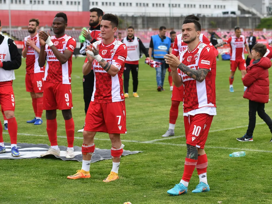 Fotbalistii dinamovisti Azankpo Desire Segbe, Steliano Filip si Cosmin Gabriel Matei saluta galeria dupa meciul de fotbal dintre Dinamo Bucuresti si Academica Clinceni, contand pentru Play-out-ul Ligii 1 Casa Pariurilor, desfasurat pe Stadionul Dinamo din Bucuresti, sambata 30 aprilie 2022. © FOTO:Razvan Pasarica/SPORT PICTURES
