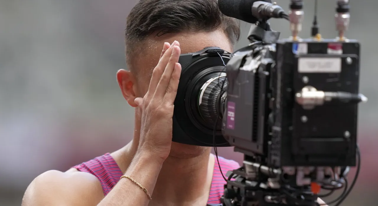 Devon Allen, of United States looks into a TV camera after winning a men's 110-meter hurdles semifinal at the 2020 Summer Olympics, Wednesday, Aug. 4, 2021, in Tokyo, Japan. (AP Photo/Martin Meissner)