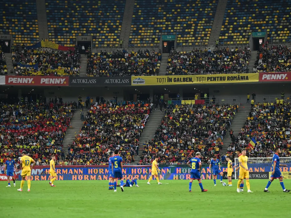 Tinerii suporteri romani isi incurajeaza favoritii in meciul de fotbal dintre Romania si Andorra, din cadrul preliminariilor Campionatului European 2024, desfasurat pe Arena Nationala, duminica 15 octombrie 2023. © FOTO:Razvan Pasarica/SPORT PICTURES