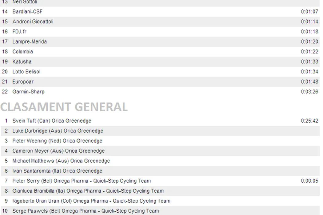 Orica-GreenEdge, victorie în debutul Giro 2014, Tuft, primul ciclist în roz. Purito Rodriguez e marele perdant al contratimpului pe echipe