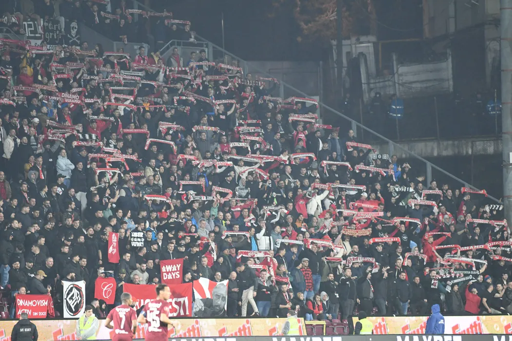 Galeria dinamovista cu esarfe si fulare isi incurajeaza favoritii in meciul de fotbal dintre FC CFR 1907 Cluj si Dinamo Bucuresti, contand pentru Superliga Superbet, desfasurat pe Stadionul Dr.Constantin Radulescu din Cluj-Napoca, sambata 15 martie 2025. © FOTO: Flaviu Buboi/SPORT PICTURES