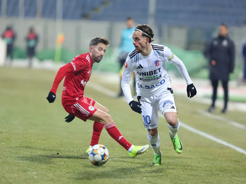 Stefan Bodisteanu si Andre Miguel Pinto Lopes in meciul de fotbal dintre FC Botosani si SC Otelul Galati, contand pentru Superliga Superbet, desfasurat pe Stadionul Municipal din Botosani, luni 2 februarie 2026. © FOTO:Sorin Pana/SPORT PICTURES