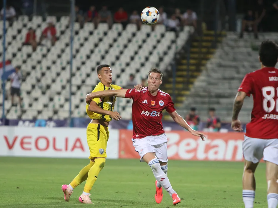 Diego Zivulici si Catalin Ionut Cirjan in meciul de fotbal dintre SC Otelul Galati si Dinamo Bucuresti, contand pentru Superliga Superbet, desfasurat pe Stadionul Otelul din Galati, duminica 27 iulie 2025. © FOTO:Valentin Munteanu/SPORT PICTURES