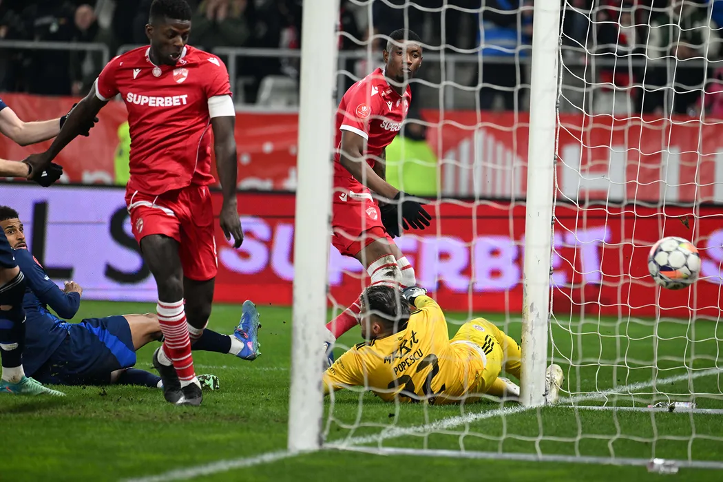 Vhakka Eddy Stelh Gnahore marchează un gol anulat de langa Martin Yves Angha si Kennedy Kofi Boateng in meciul de fotbal dintre Dinamo Bucuresti si Otelul Galati, din cadrul Superligii Superbet, desfasurat pe Stadionul National Arcul de Triumf din Bucuresti, marti 4 februarie 2025. © FOTO:Razvan Pasarica/SPORT PICTURES