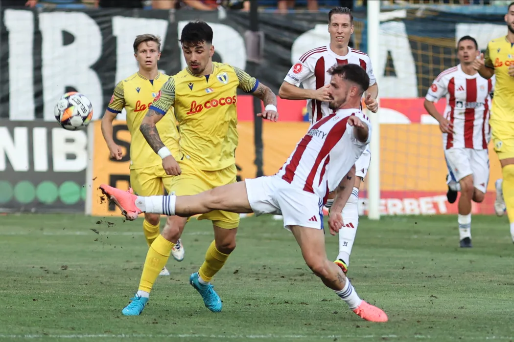 Sergiu Cătălin Hanca și Joao Pedro Santos Lameira în meciul de fotbal dintre FC Petrolul Ploiești și SC Oțelul Galați, contând pentru Superliga Superbet, desfășurat pe Stadionul Ilie Oană din Ploiești, vineri 23 august 2024. © FOTO: Gică FLUȘTER/SPORT PICTURES