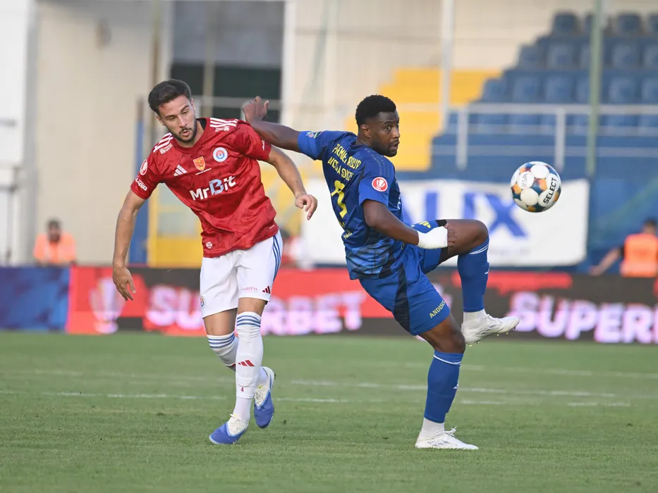 Manuel Alberto Cunha Lopes si Ahmed Said Said in meciul dintre Unirea Slobozia si Otelul Galati, contand pentru Superliga Superbet, desfasurat pe Clinceni Arena din Clinceni, luni 4 august 2025. © FOTO:Razvan Pasarica/SPORT PICTURES