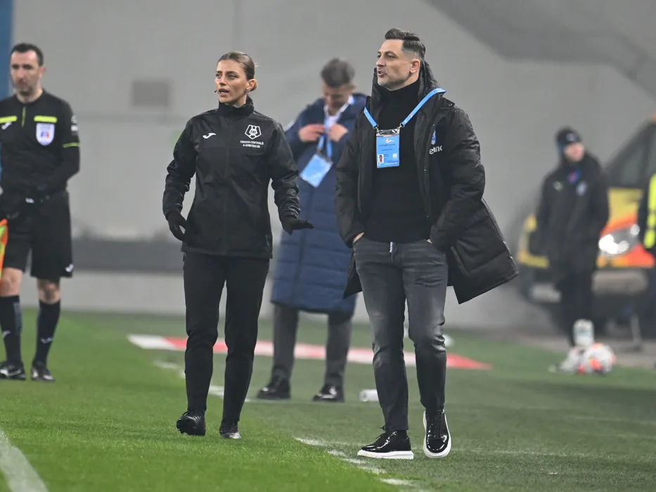 Arbitrul de rezerva Ana Maria Terteleac alături de Mirel Matei Radoi in meciul dintre Universitatea Craiova si Otelul Galati, contand pentru Superliga Superbet, desfasurat pe Stadionul Ion Oblemenco din Craiova, vineri 14 februarie 2025. © FOTO:Razvan Pasarica/SPORT PICTURES