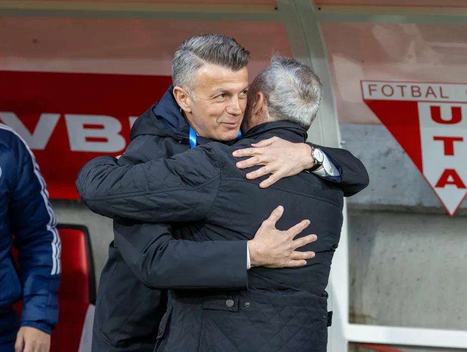 Cei doi antrenori Mircea Rednic si Ovidiu Nicusor Burca se saluta inaintea meciului de fotbal dintre UTA Arad si SC Otelul Galati, contand pentru Superliga Superbet - Play-Out, desfasurat pe Arena Francisc Neuman din Arad, duminica 16 martie 2025. © FOTO: Sebastian Tataru/SPORT PICTURES