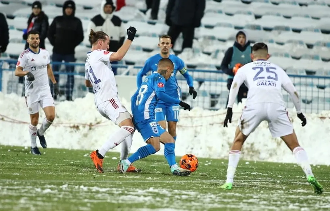 Alexandru Mateiu și Nicușor Silviu Bancu , Diego Zivulic în meciul de fotbal dintre ACS SUPORTER CLUB OTELUL GALATI si UNIVERSITATEA CRAIOVA, contând pentru Superliga Superbet, desfășurat pe Stadionul Oțelul din Galați, duminică 26 noiembrie 2023. © FOTO: Sorin PANĂ/SPORT PICTURES