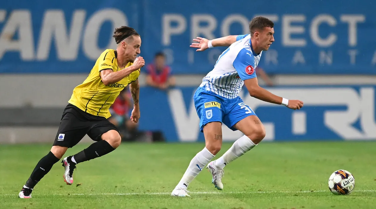 Stefan Bodisteanu si Mihai Alexandru Isfan in meciul de fotbal dintre Universitatea Craiova si Otelul Galati, contand pentru Superliga Superbet, desfasurat pe Stadionul Ion Oblemenco din Craiova, luni 24 iulie 2023. © FOTO:Razvan Pasarica/SPORT PICTURES