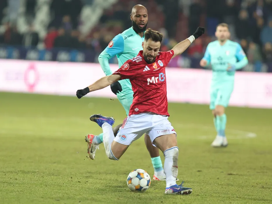 Virgil Andrei Ciobanu si Hakim Djamel Abdallah in meciul de fotbal dintre SC Otelul Galati si UTA Arad, contand pentru Superliga Superbet, desfasurat pe Stadionul Otelul din Galati, vineri 20 februarie 2026. © FOTO:Sorin Pana/SPORT PICTURES