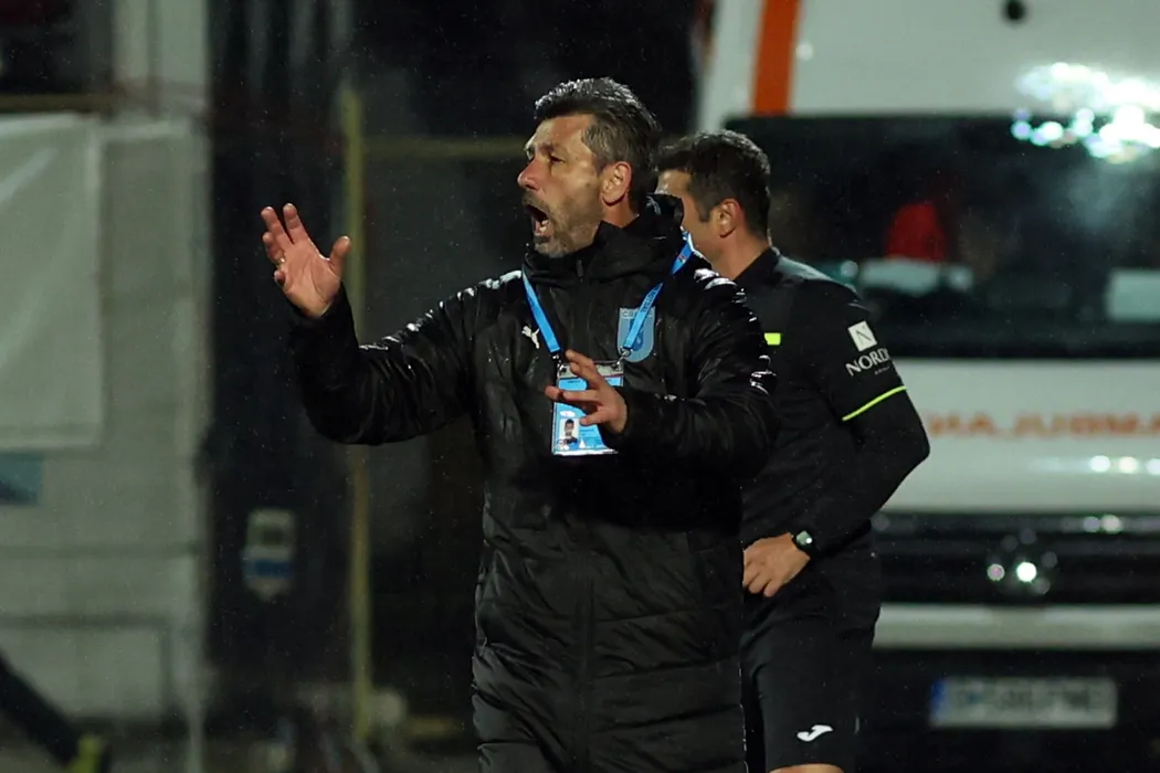 Marinos Ouzounidis, antrenorul echipei Universitatea Craiova urmareste meciul de fotbal contra formatiei FCSB din etapa 29 a Ligii 1, disputat pe stadionul Marin Anastasovici din Giurgiu, duminica, 4 aprilie 2021. GEORGE FILIP / MEDIAFAX FOTO