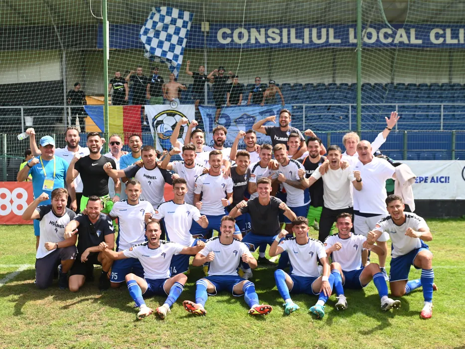 Fotbalistii din Dej alaturi de antrenorul lor Dragos Militaru se bucura intr-o fotografie de grup realizata dupa victoria din meciul de fotbal dintre Dinamo Bucuresti si Unirea Dej, contand pentru Liga 2, desfasurat pe Clinceni Arena din Clinceni 2022, sambata 27 august 2022. © FOTO:Razvan Pasarica/SPORT PICTURES