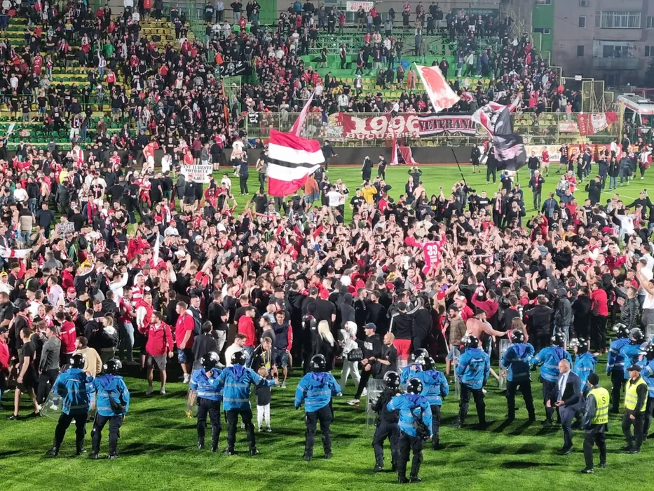 Faceti loc, vin cainii rosii! Promovarea lui Dinamo in Superliga a declansat nebunia la Mioveni: fanii alb-rosilor au invadat terenul! VIDEO