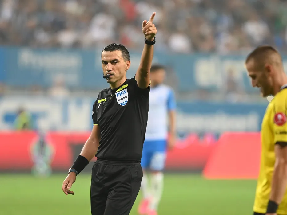Arbitrul central Ovidiu Hategan reactioneaza in meciul de fotbal dintre Universitatea Craiova si Otelul Galati, contand pentru Superliga Superbet, desfasurat pe Stadionul Ion Oblemenco din Craiova, luni 24 iulie 2023. © FOTO:Razvan Pasarica/SPORT PICTURES