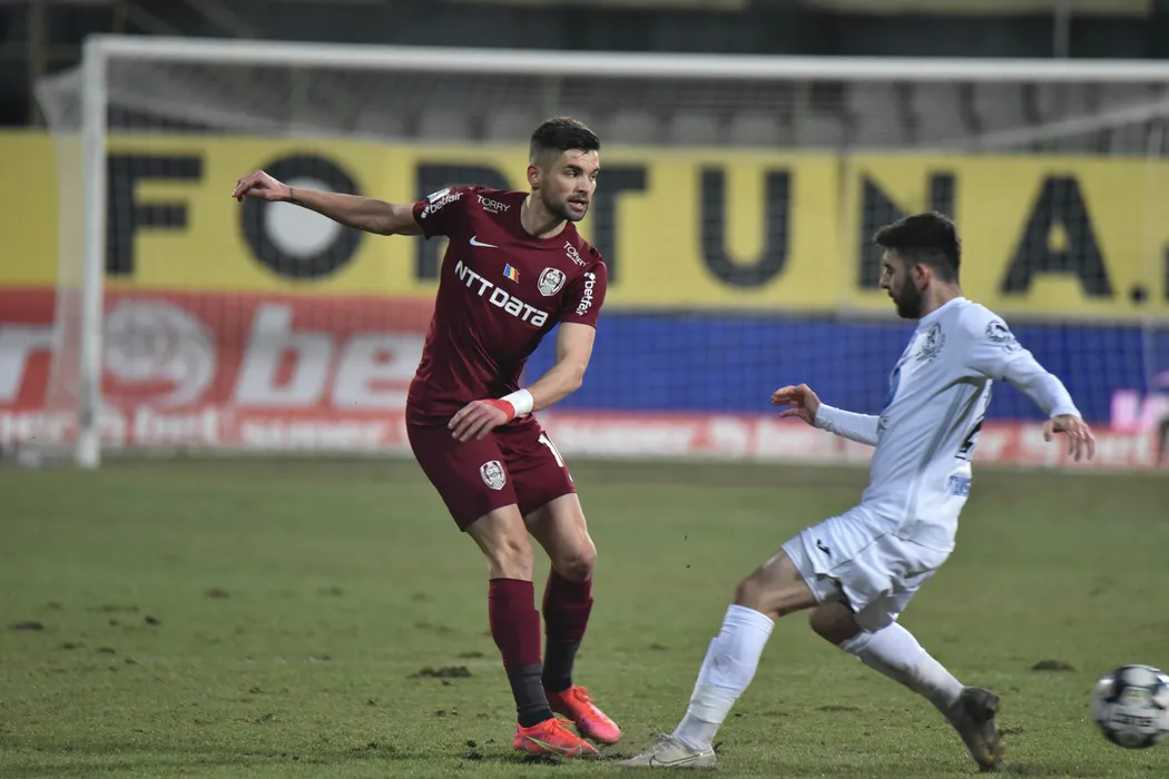 Mateo Susic si Ovidiu Horsia in meciul de fotbal dintre Gaz Metan Medias si CFR Cluj, contand pentru Liga 1 Casa Pariurilor, desfasurat fara spectatori pe Stadionul Municipal din Medias, duminica 21 februarie 2021. © FOTO:Alexandru Veres/SPORT PICTURES
