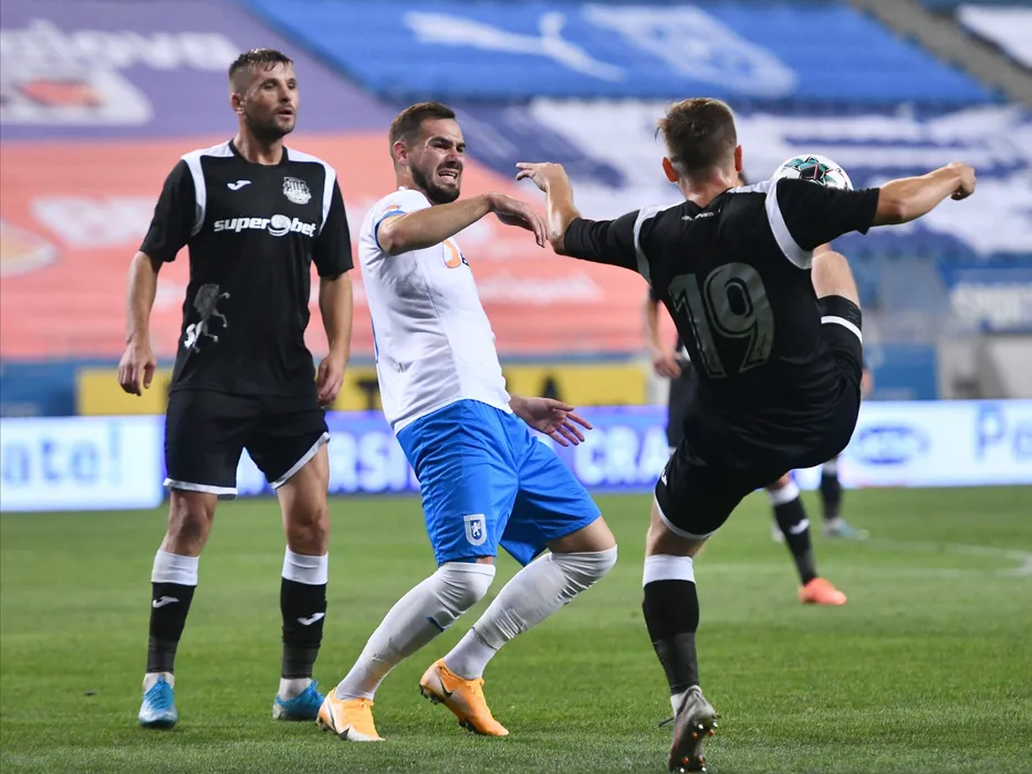 Marius Ovidiu Mihalache si Elvir Koljic in meciul de fotbal dintre Universitatea Craiova si CSM Politehnica Iasi, contand pentru Liga 1 Casa Pariurilor, desfasurat fara spectatori pe Stadionul Ion Oblemenco din Craiova, vineri 2 octombrie 2020. © FOTO:Razvan Pasarica/SPORT PICTURES