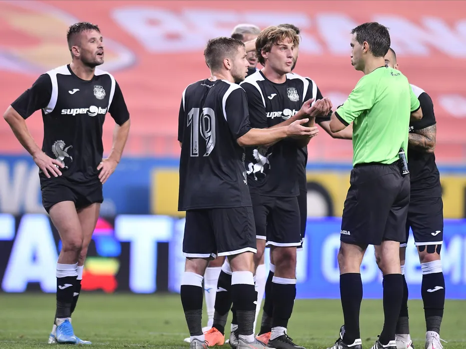 Arbitrul central Ovidiu Hategan ii acorda cartonasul rosu lui Marius Ovidiu Mihalache spre nedumerirea colegilor sai Manuel Ignaciu De Iriondo si Phillipe Razvan Onea in meciul de fotbal dintre Universitatea Craiova si CSM Politehnica Iasi, contand pentru Liga 1 Casa Pariurilor, desfasurat fara spectatori pe Stadionul Ion Oblemenco din Craiova, vineri 2 octombrie 2020. © FOTO:Razvan Pasarica/SPORT PICTURES