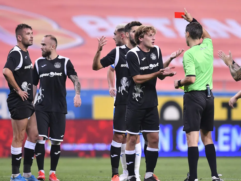 Arbitrul central Ovidiu Hategan ii acorda cartonasul rosu lui Marius Ovidiu Mihalache spre nedumerirea colegilor sai Manuel Ignaciu De Iriondo si Marian Sorin Busu in meciul de fotbal dintre Universitatea Craiova si CSM Politehnica Iasi, contand pentru Liga 1 Casa Pariurilor, desfasurat fara spectatori pe Stadionul Ion Oblemenco din Craiova, vineri 2 octombrie 2020. © FOTO:Razvan Pasarica/SPORT PICTURES