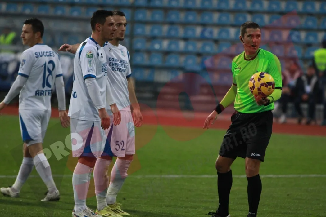 Pandurii – FC Botoșani 1-2. Arbitrul Cojocaru a dictat inițial penalty pentru gazde în minutul 37, dar s-a răzgândit după ce s-a sfătuit cu asistenții