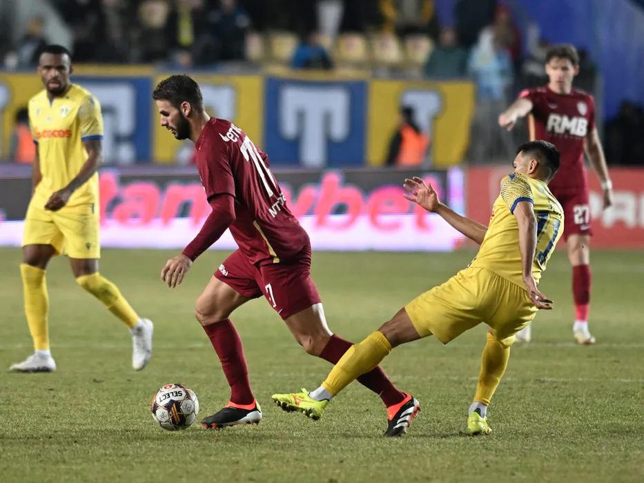 Panagiotis Tachtsidis si Seto Takayuki în meciul de fotbal dintre Petrolul Ploiesti si CFR Cluj, contând pentru Superliga Superbet, desfășurat pe Stadionul Ilie Oana din Ploiesti, sambata 3 februarie 2024. © FOTO: Răzvan PĂSĂRICĂ/SPORT PICTURES