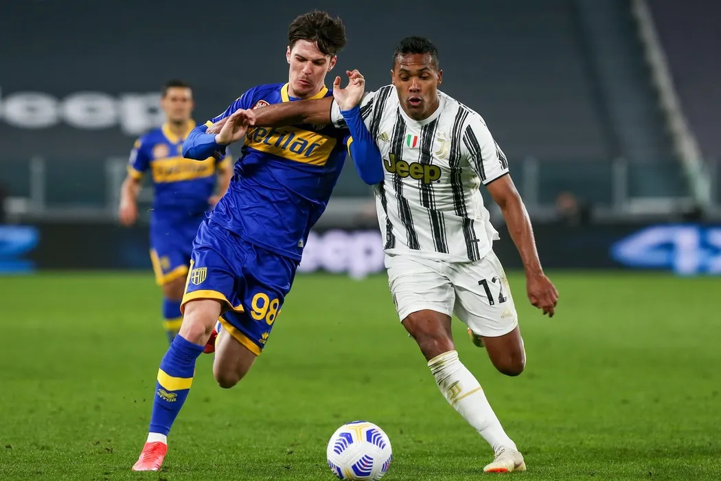 Alex Sandro of Juventus FC and Dennis Man of Parma Calcio 1913 during the Serie A football match between Juventus FC and Parma Calcio 1913 at Allianz Stadium on April 21, 2021 in Turin, Italy.