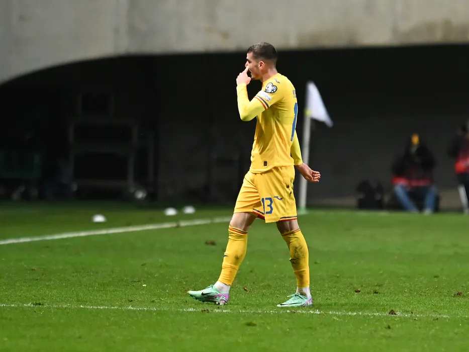 Valentin Mihaila paraseste terenul eliminat din meciul de fotbal dintre Israel si Romania, din cadrul preliminariilor Campionatului European 2024, desfasurat pe Puskás Akadémia Pancho Aréna din Felcsut, sambata 18 noiembrie 2023. © FOTO:Razvan Pasarica/SPORT PICTURES