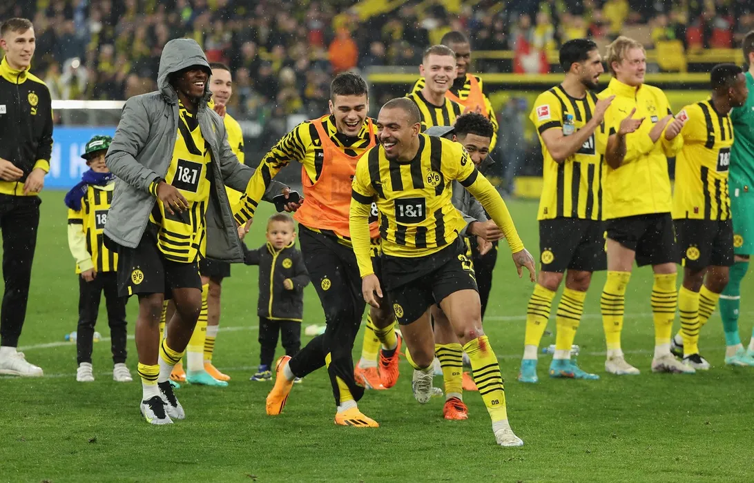 22.04.2023, Fussball Bundesliga, Borussia Dortmund - Eintracht Frankfurt, emonline, emspor, v.l., Dortmund-Spieler feiern mit den Fans, Donyell Malen Borussia Dortmund DFL/DFB REGULATIONS PROHIBIT ANY USE OF PHOTOGRAPHS AS IMAGE SEQUENCES AND/OR QUASI-VIDEO. xdcx *** 22 04 2023, Football Bundesliga, Borussia Dortmund Eintracht Frankfurt, emonline, emspor, v l , Dortmund players celebrate with fans, Donyell painting Borussia Dortmund DFL DFB REGULATES PROHIBIT ANY USE OF PHOTOGRAPHS AS IMAGE SEQUENCES AND OR QUASI VIDEO xdcx Copyright: HMBxMedia,Image: 771199054, License: Rights-managed, Restrictions: , Model Release: no