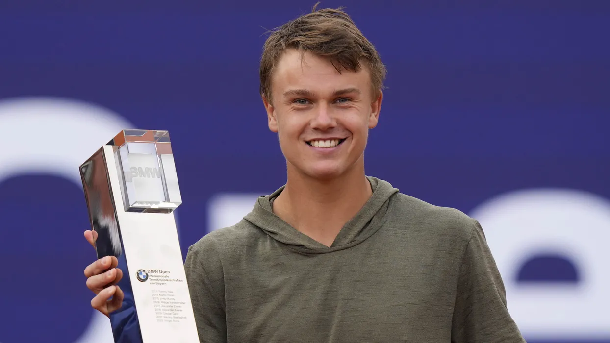 Holger Rune of Denmark lifts the trophy after winning the final match against Botic Van De Zandschulp of the Netherlands at the Tennis ATP tournament in Munich, Germany, Sunday, April 23, 2023. (AP Photo/Matthias Schrader)