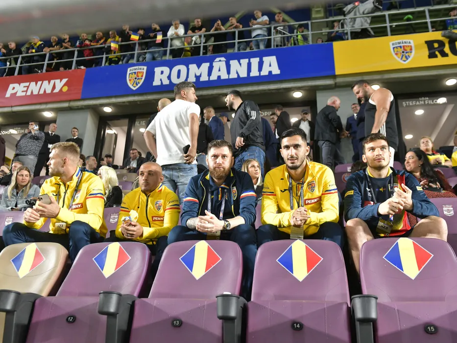 Fotbalistii romani Alexandru Cretu, Alexandru Mitrita, Andrei Ivan si Mihai Aioanei asista din tribuna la meciul de fotbal dintre Romania si Muntenegru, contand pentru Liga Natiunilor, desfasurat pe Stadionul Rapid Giulesti din Bucuresti, marti 14 iunie 2022. © FOTO:Razvan Pasarica/SPORT PICTURES