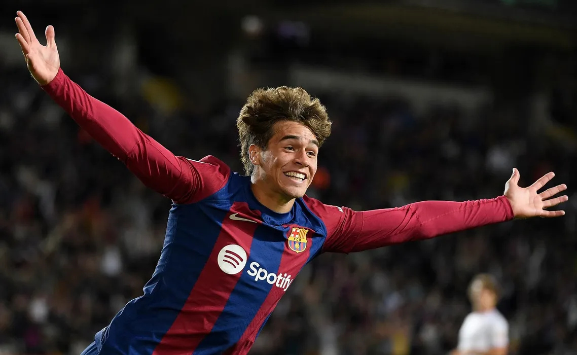 Barcelona's Spanish forward #38 Marc Guiu celebrates after scoring his team's first goal during the Spanish league football match between FC Barcelona and Athletic Club Bilbao at the Estadi Olimpic Lluis Companys in Barcelona on October 22, 2023.,Image: 815896786, License: Rights-managed, Restrictions: , Model Release: no