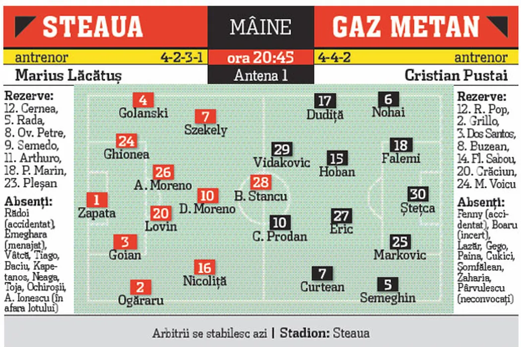 Patru jucători ai Stelei vor sta pe bancă la meciul cu Gaz Metan