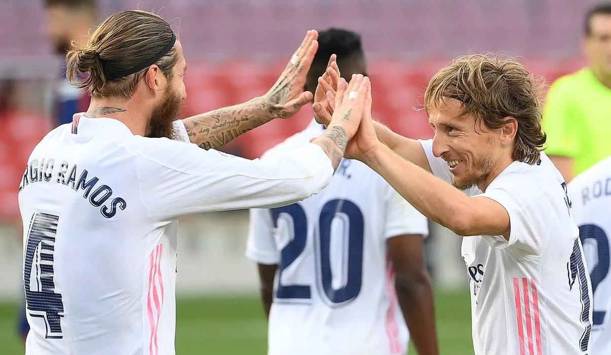 Real Madrid's Croatian midfielder Luka Modric (R) celebrates with Real Madrid's Spanish defender Sergio Ramos after scoring a goal during the Spanish League football match between Barcelona and Real Madrid at the Camp Nou stadium in Barcelona on October 24, 2020.,Image: 565370217, License: Rights-managed, Restrictions: , Model Release: no