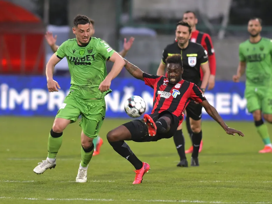 Paul Viorel Anton si Ngapot Abdel Aziz Lamanje in meciul de fotbal dintre Astra Giurgiu si Dinamo Bucuresti, contand pentru semifinala tur a Cupei Romaniei, desfasurat fara spectatori pe Stadionul Marin Anastasovici din Giurgiu, marti 13 aprilie 2021. © FOTO:Razvan Pasarica/SPORT PICTURES