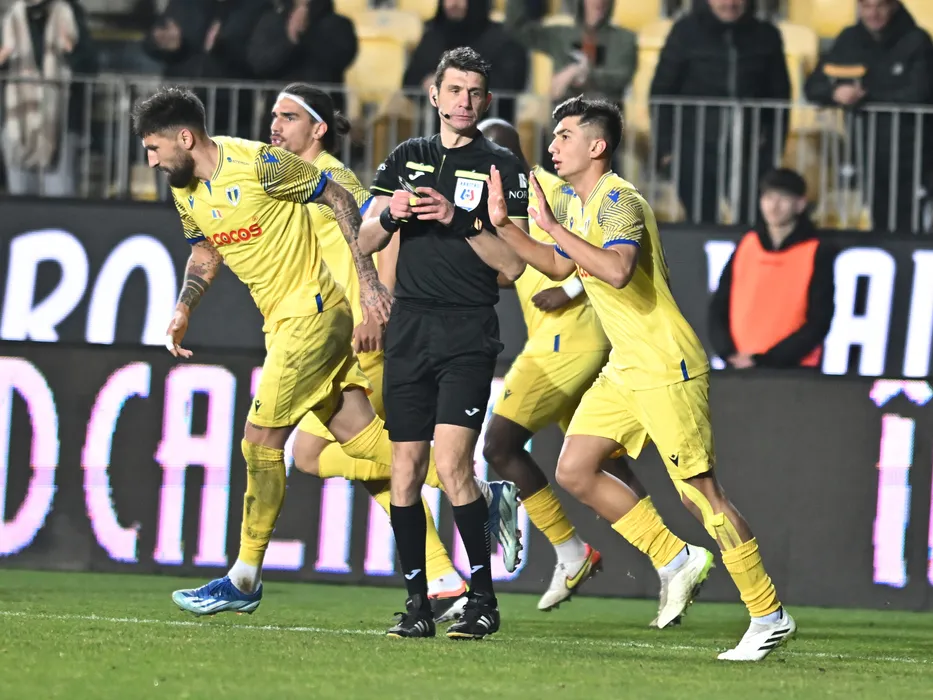 Alexandru Marian Musi se bucură dupa un gol marcat alături de Paul Papp si Marian Fernando Huja sub privirile arbitrului central Horia Gabriel Mladinovici în meciul de fotbal dintre Petrolul Ploiesti si Politehnica Iasi, contând pentru Superliga Superbet, desfășurat pe Stadionul Ilie Oana din Ploiesti, vineri 16 februarie 2024. © FOTO: Răzvan PĂSĂRICĂ/SPORT PICTURES