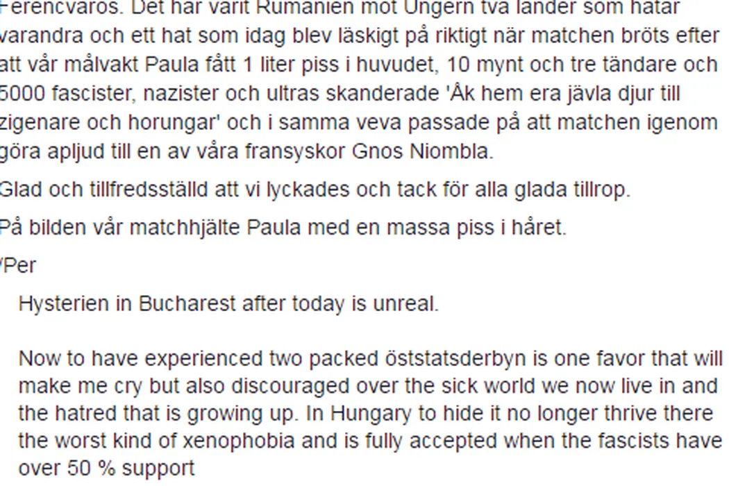 „Paula a primit un litru de urină în cap! 5.000 de ultrași au strigat: duceți-vă acasă, țiganilor, animalelor, orfanilor!”. Dezvăluiri din infern. Per Johansson a povestit ce s-a întâmplat la Ferencvaros – CSM București