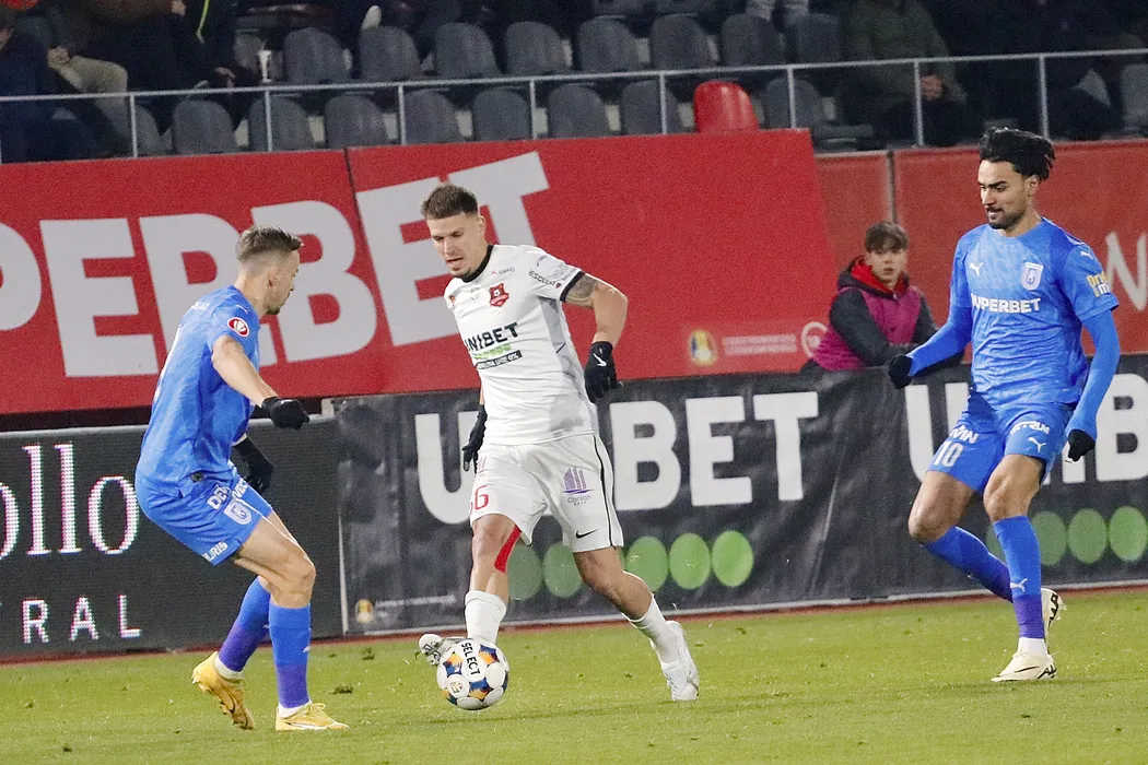 Tiberiu Ionut Capusa si Nicusor Silviu Bancu, Stefan Baiaram in meciul de fotbal dintre AFC Hermannstadt Sibiu si Universitatea Craiova, contand pentru Superliga Superbet, desfasurat pe Stadionul Municipal din Sibiu, duminica 14 decembrie 2025. © FOTO:Valentin Macrea/SPORT PICTURES