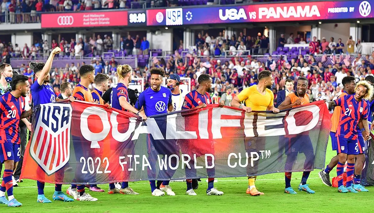 ORLANDO, FLORIDA - MARCH 27: The United States Mens National Team hold a 2022 FIFA World Cup Qualified banner after defeating Panama 5-1 at Exploria Stadium on March 27, 2022 in Orlando, Florida. (Photo by Julio Aguilar/Getty Images)
