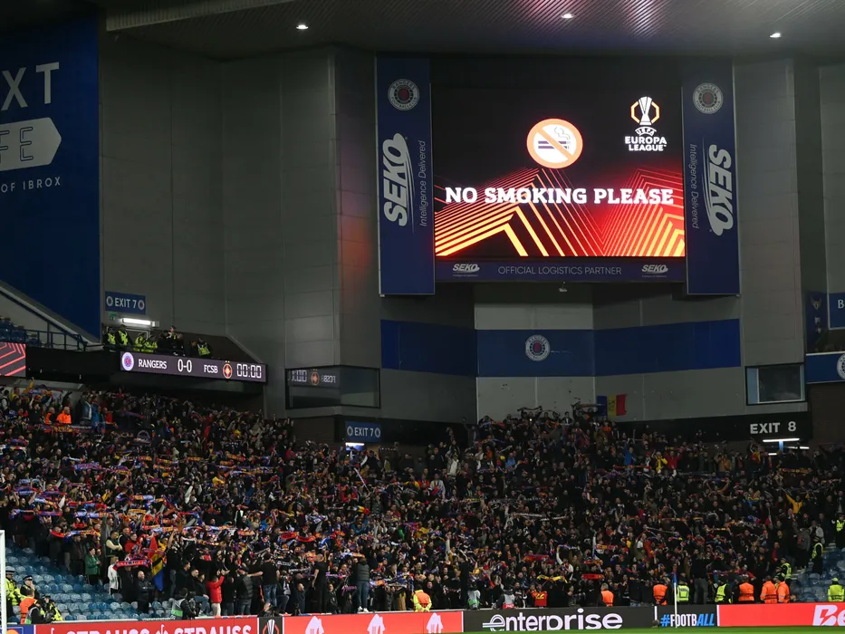 Suporterii din galeria stelista cu fularele si esarfele deasupra capetelor la meciul de fotbal dintre Glasgow Rangers si FCSB, din cadrul UEFA Europa League, desfasurat pe Stadionul Ibrox Park din Glasgow, joi 24 octombrie 2024. © FOTO:Razvan Pasarica/SPORT PICTURES