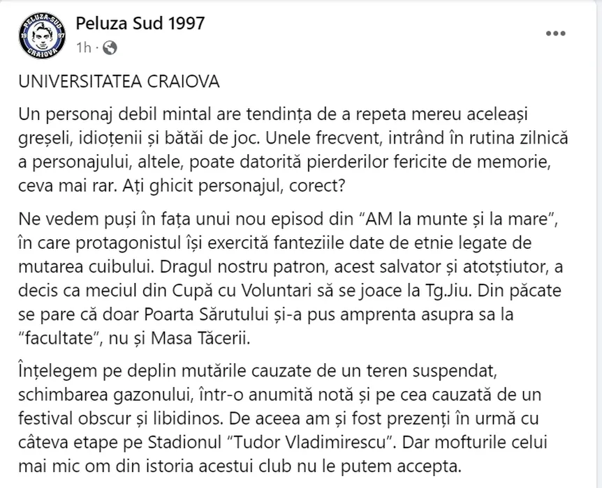 Peluza Sud 97 dă de pâmânt cu Adrian Mititelu și nu susține echipa la Târgu Jiu pentru meciul cu FC Voluntari din Cupa României Betano. „Un personaj debil mintal!”