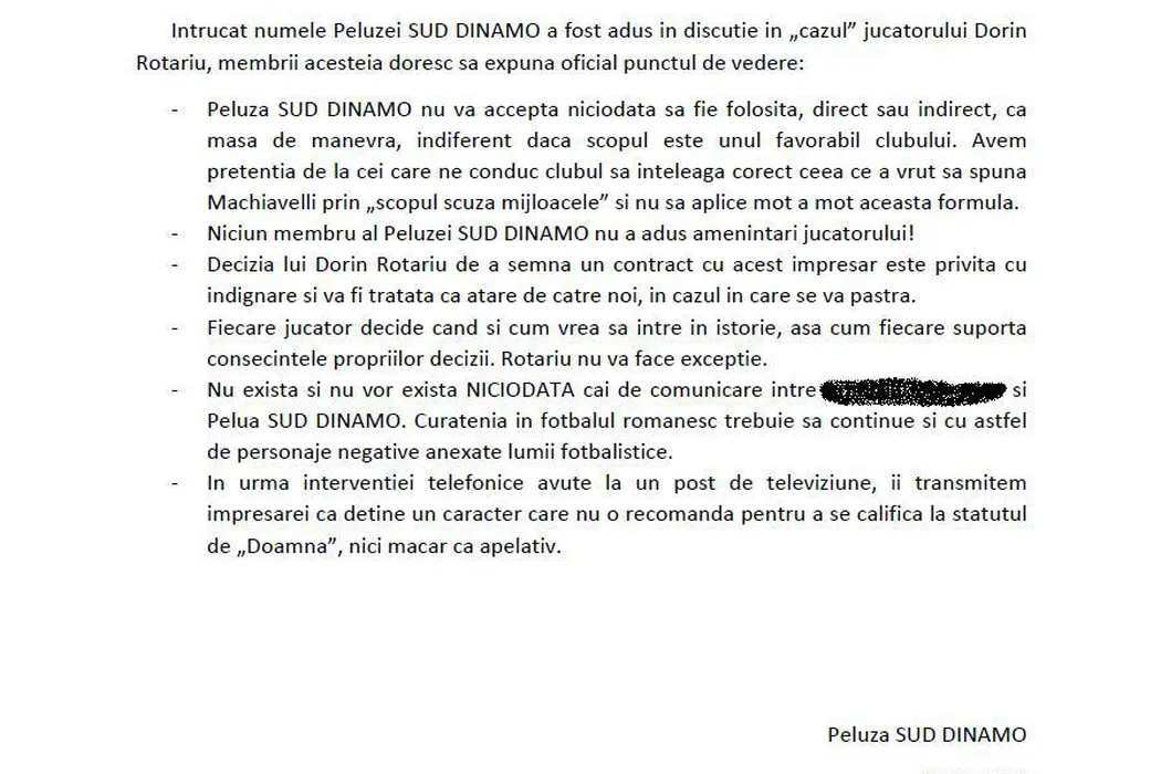 Peluza Sud Dinamo ia atitudine în cazul Rotariu: „Decizia jucătorului de a semna cu acest impresar este privită cu indignare și va fi tratată ca atare”