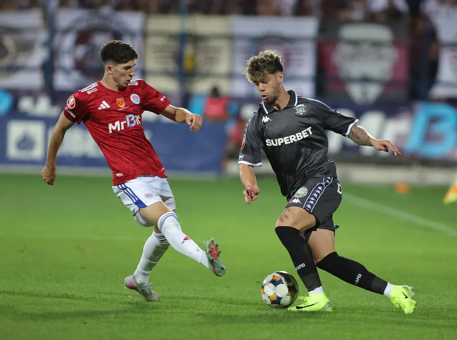 Sebastian Andrei Borza si Stefan Daniel Bana in meciul de fotbal dintre SC Otelul Galati si FC Rapid Bucuresti, contand pentru Superliga Superbet, desfasurat pe Stadionul Otelul din Galati, luni 11 august 2025. © FOTO:Sorin Pana/SPORT PICTURES