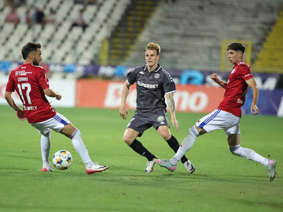 Tobias Christensen si Stefan Daniel Bana, Virgil Andrei Ciobanu in meciul de fotbal dintre SC Otelul Galati si FC Rapid Bucuresti, contand pentru Superliga Superbet, desfasurat pe Stadionul Otelul din Galati, luni 11 august 2025. © FOTO:Sorin Pana/SPORT PICTURES