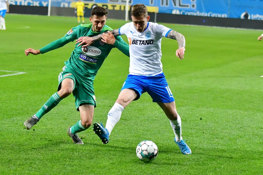 Alexandru Cicaldau (D), de la Universitatea Craiova, suteaza in timpul meciului de fotbal contra echipei Sepsi OSK din prima etapa a play-off-ului Ligii 1, disputat pe stadionul Ion Oblemenco din Craiova, sambata, 17 aprilie 2021. REMUS BADEA / MEDIAFAX FOTO