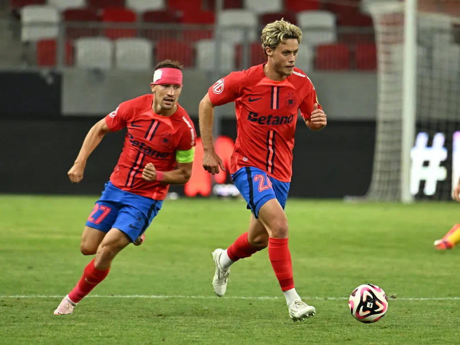 Darius Dumitru Olaru si William Guido R Baeten in meciul dintre Maccabi Tel Aviv FC si FCSB, contand pentru Preliminariile Ligii Campionilor, desfasurat pe Bozsik Arena din Budapesta, miercuri 31 iulie 2024. © FOTO:Razvan Pasarica/SPORT PICTURES